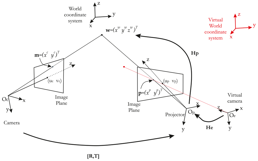 The projector is modeled like an inverted camera. Thus, its intrinsic and extrinsic parameters are similar to those of the camera. Consequently, point p˜ = (xpyp1)T (on the image plane of the projector) is projected onto the scene in w = (xwywzw)T. Thus, the relationship between p and Hp is given by: