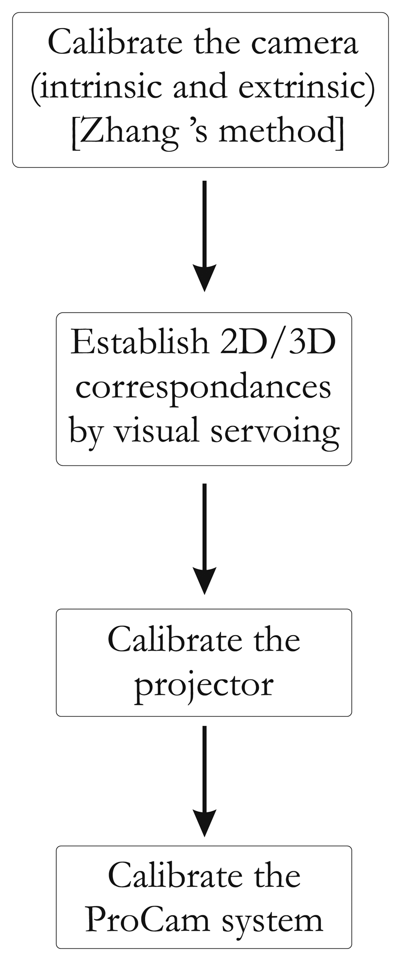 Of course, estimating 2D–3D correspondences for the projector is not straightforward. Our method consists in obtaining the 2D–3D correspondences for the projector with a virtual model of the scene coupled with a visual servoing control loop. A global overview of our method is given in Figure 4.