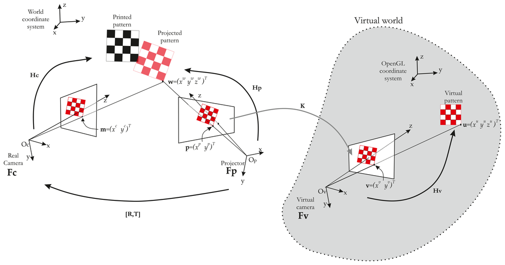 In this equation, K = Ap.Av−1, where Ap is the projector intrinsic parameter matrix and Av is the OpenGL camera intrinsic parameter matrix. However, K also represents the transformation between the two image spaces. In our case, the OpenGL camera resolution is the same as the projector resolution. Consequently, we can verify that a pixel in the OpenGL camera image plane is the same in the projector image plane and K =
