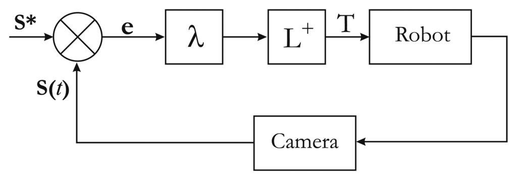 The aim of classical visual servoing is essentially to minimize error e(t) between a vector of n image sensor features s(t) seen at the current state and their desired value s* extracted from the current image (Figure 6). This can be expressed as the regulation of function e(t) called task function and defined as: