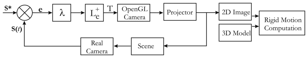 There is no robot end-effector to control only the OpenGL camera. Moreover, and unlike a classical visual servoing, the OpenGL camera is controlled, but cannot measure the image error e(t). In contrast, the “real camera” is used to measure e(t), but is not controlled (Figure 7). Hence, we need to consider the rigid motion between the OpenGL camera (therefore, the projector) and the real camera [R, t] (Figure 5). Thus, the image Jacobian must take the rigid motion into account with a new image Jacobian Le: