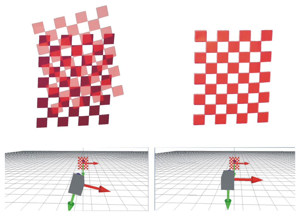 Let us consider a 3D point, u, projected in a virtual work space with the coordinates, (xuyuzu)T, expressed by ũ in homogeneous coordinates (Figure 5). Let ṽ = (xvyv1)T be the projected point by the virtual camera in the virtual world, such as: