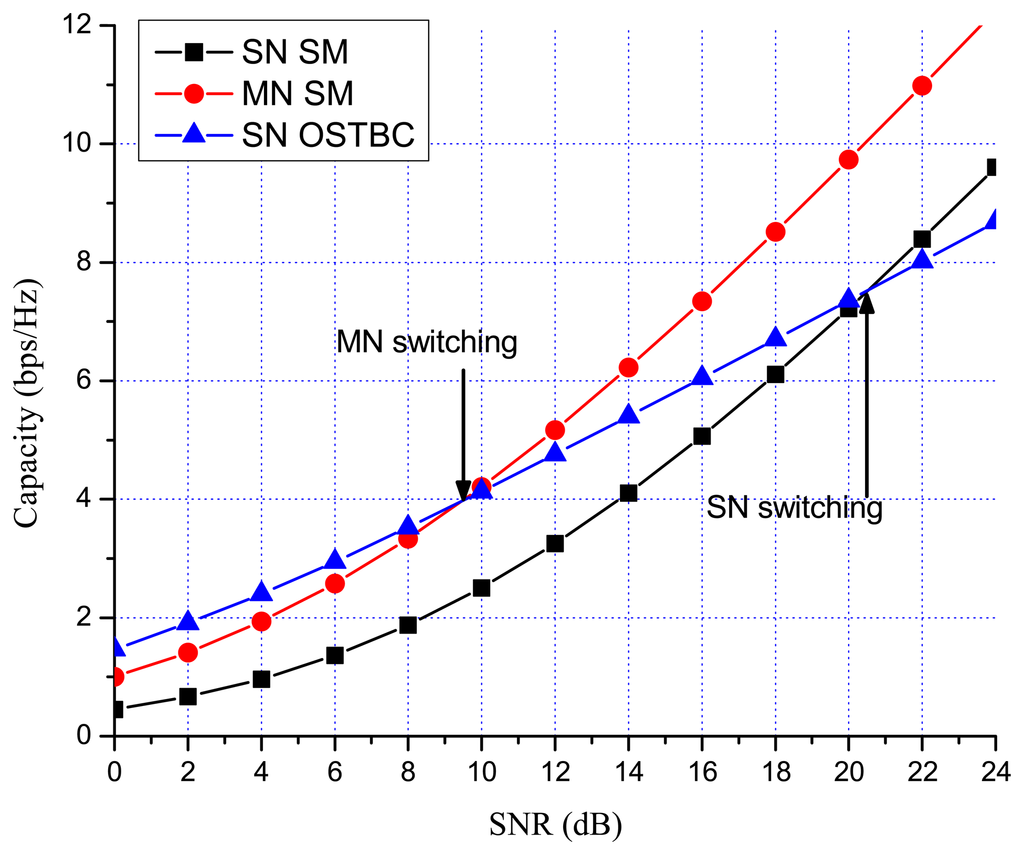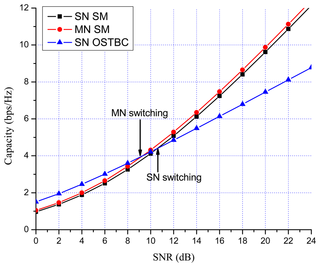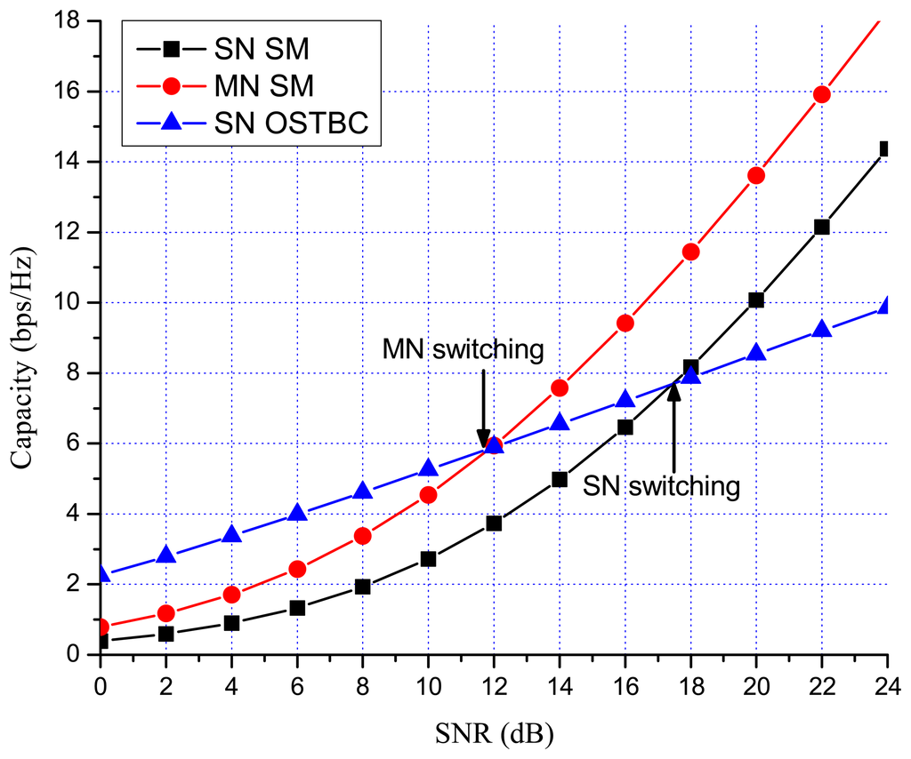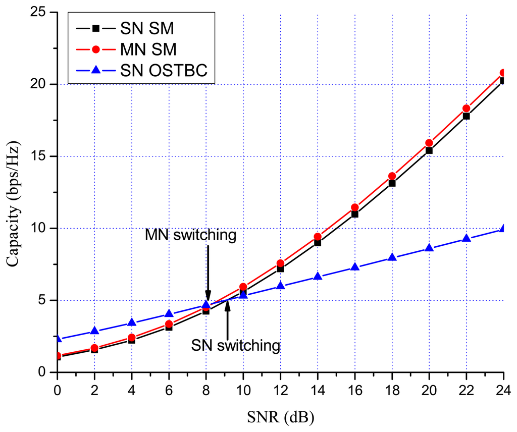 We can also calculate SNR crossing points between MN (or SN) SM and SN OSTBC by equating Equations (12) and (16). Although numerical calculation is necessary for a large number of antennas, the SNR crossing point can be easily obtained for two and three antennas. For example, for M = N = 2, the SNR crossing point, γOSTBC-SM, can be represented as:
