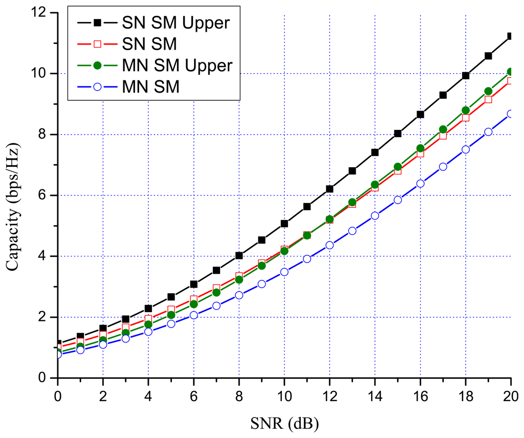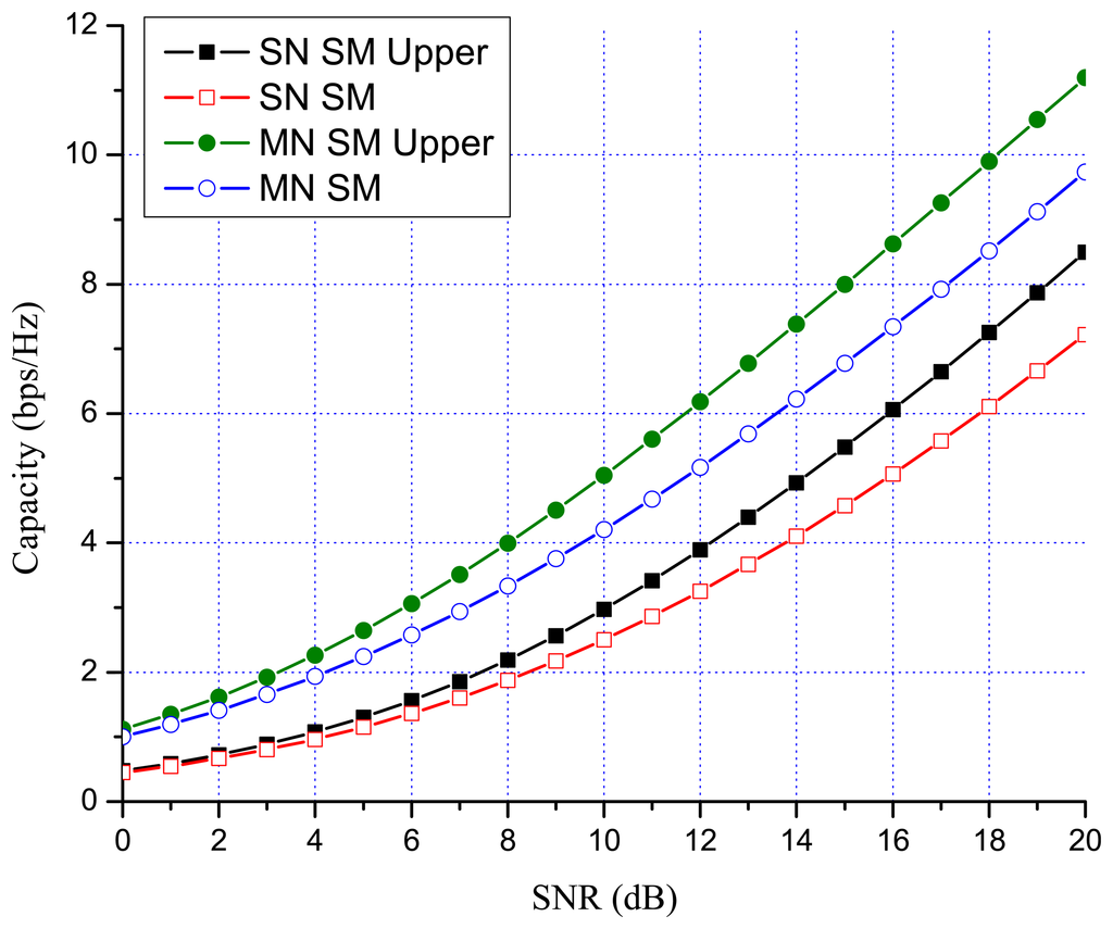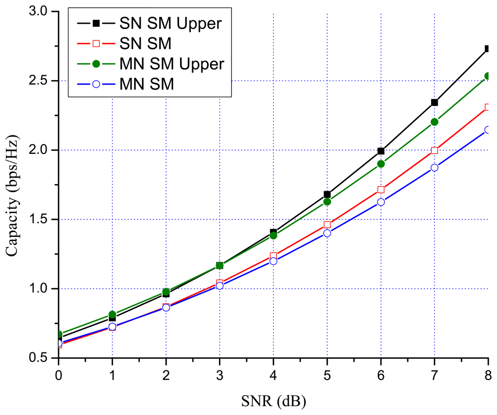 Note that correlation and path gain are the main parameters that determine the SM capacity. MN transmission can avoid spatial correlation, increasing the capacity, while power loss is experienced due to , decreasing the capacity. Thus, the SM comparison result is significantly dependent upon the path gain ratio and spatial correlation. For the capacity of SN SM, SEN1 SM provides better performance than SEN2 SM when the following inequality holds, and vice versa.