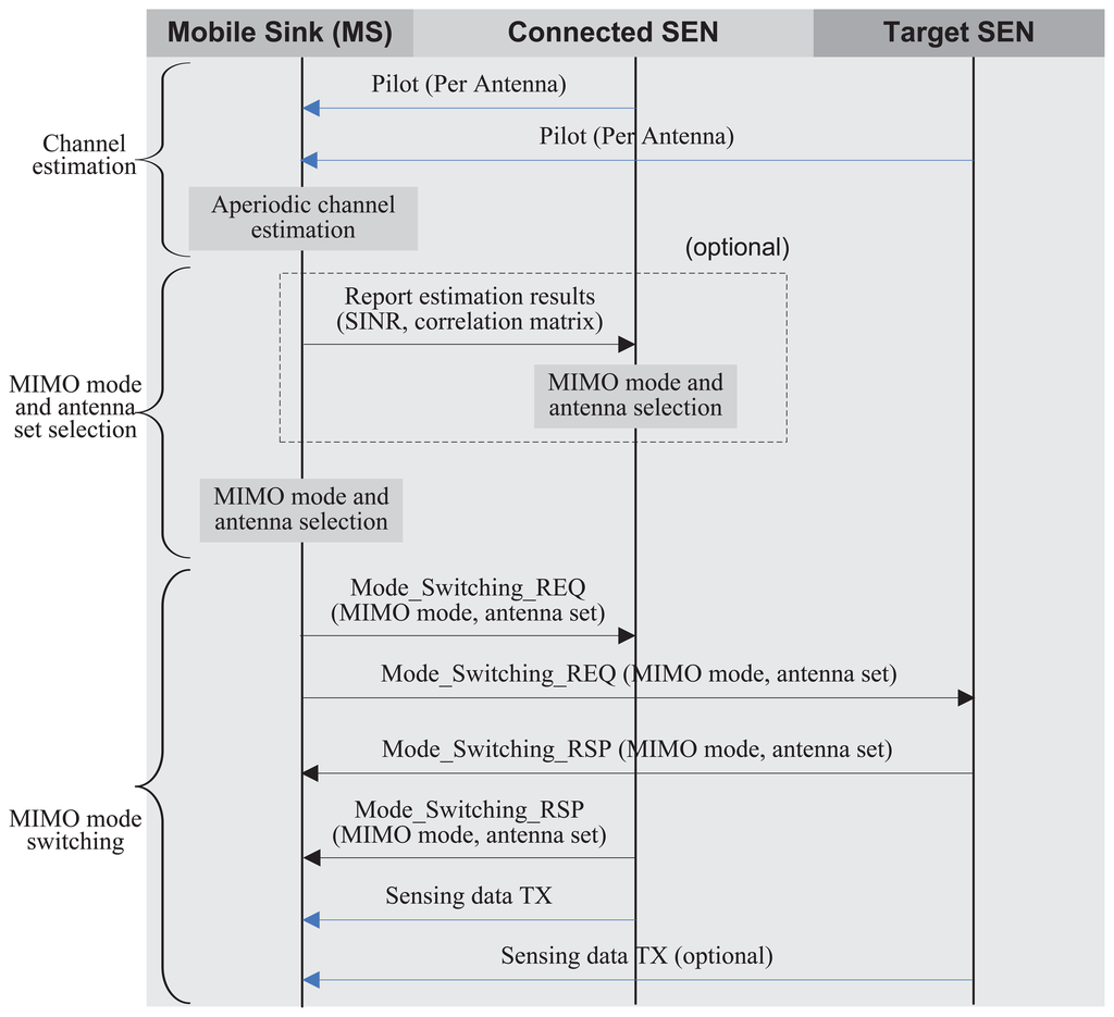 Figure 5 illustrates the overall sequences of the proposed scheme in an MS and SENs. As shown in Figure 5, an MS periodically measures the link quality, including the average SNR and the spatial correlation for a part or all antenna sets from multiple SENs. To measure the link quality, the MS usually exploits the predetermined reference pilot signals that are orthogonally transmitted from transmit antennas [40]. By correlating the received pilot signals transmitted from different antennas for much longer than the channel coherence time, the transmit antenna correlation can be estimated, whereas the receive antenna correlation can be obtained by correlating received pilot symbols of different receive antennas transmitted from the same transmit antenna [41]. The average SNR can also be estimated without much complexity. Based on the channel estimation results, either an SEN or MS determines an appropriate antenna set and a MIMO mode. In the proposed algorithm, ergodic capacity expressions Equations (11) and (13) (or their bounds, Equations (12) and (16)) can be the cost functions to find an optimal antenna set and a MIMO transmission mode. If the SEN determines an antenna set and a MIMO mode, the MS should report the channel estimation result to the SEN. Otherwise, the MS selects an optimal antenna set and MIMO mode and sends a MIMO-mode-switching request to the SEN. To maximize the capacity, SN (or MN) SM or SN OSTBC transmission can be selected from Equations (11) and (13) (or their bounds, Equations (12) and (16)) by calculating the determinants of the correlation matrix, e.g., Equations (6) and (7). Specific SNR crossing-points will be presented in the following section with detailed derivation for the two-antenna case. After antenna and MIMO mode selection, the currently connected SEN notifies the selected antenna set and MIMO mode to the MS, and the MS forwards it to the target SEN by transmitting a Mode Switching REQ message only when the multi-node MIMO scheme is selected. If the target SEN has enough power to support the requested MIMO mode for the MS, then it sends a Mode Switching RSP message to the MS. Then, the MS sends a Mode Switching RSP message to the currently connected SEN with the confirmation of the selected MIMO mode and antenna set. Finally, the connected SEN and the target SEN update the MIMO mode and transmit the sensing data using the selected antenna and MIMO mode.