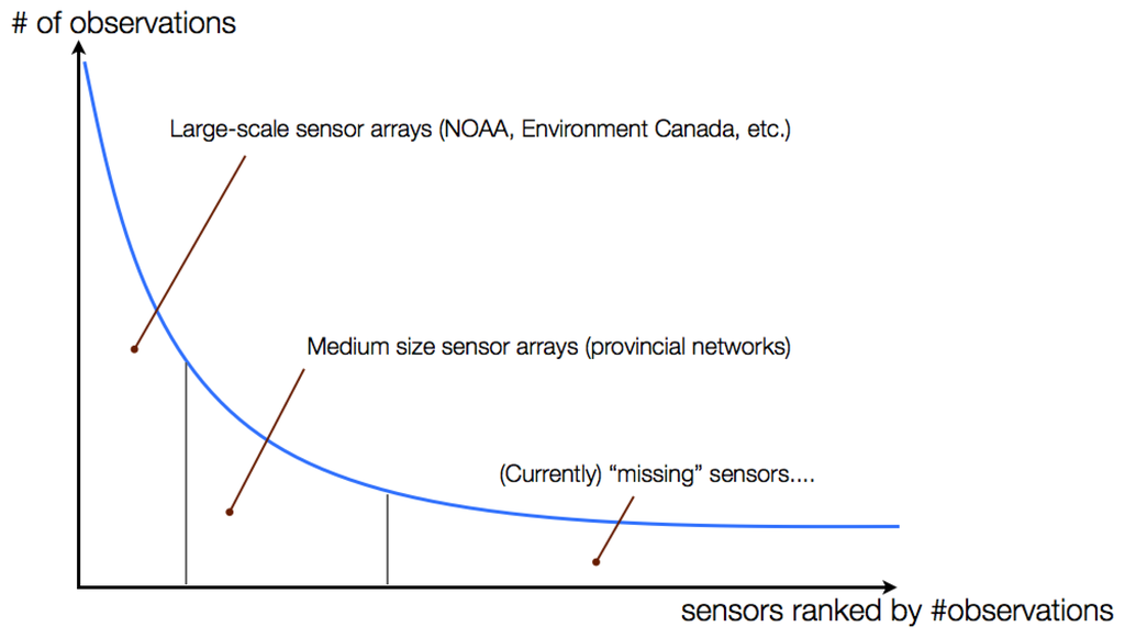 The concept of sensor web is to connect all the sensors in the world and their data together to achieve shared goals [12]. A major objective of sensor web is to improve the openness and accessibility of sensor data, which we refer to this as the open data for sensor web. However, the long tail phenomenon in the sensor web that we have previously observed [13] could cause issues on the open data for sensor web vision. As shown in Figure 1, we divide the long tail into three parts, namely the head, the middle, and the tail. The head mainly consists of large scale sensor arrays operated by national organizations, such as NOAA and Environment Canada. Although the number of these large organizations is small, they collect a vast amount of sensor data. The middle contains medium size sensor arrays, which are usually maintained by provincial organizations. Compared to the head, the middle has more operating organizations but a smaller amount of sensor data. The sensor data in the tail are collected by small organizations or individuals, such as small research groups and scientists. However, unlike the head and the middle, the small organizations and individuals in the tail usually do not maintain sensor arrays for a long period of time; instead, they collect data based on the need of their short term projects. Therefore, although there are a large number of participants in the tail, the amount of sensor data collected by each of them is small.