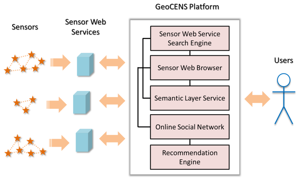Similar to that in the WWW, everyone can build and deploy sensor web services to host sensor data. Sensor web services may be distributed worldwide and are not registered on any catalogue service. GeoCENS proposes the sensor web service search engine to discover and index sensor web services, and allow users to search these services with query criteria. GeoCENS also develops a pure client-side sensor web browser application for users to retrieve and visualize sensor data from sensor web services. In addition, the semantic layer service utilizes the metadata in the sensor web services to integrate the heterogeneous sensor data layers to provide users a coherent view on the sensor web data. Furthermore, GeoCENS has an online social network component that allows users to establish friendships and share sensor data. With the friendship links on the online social network, GeoCENS provides the recommendation engine which has the ability to recommend sensors and datasets according to a user's interests. In the next sub-sections, we provide details of the various components of GeoCENS.