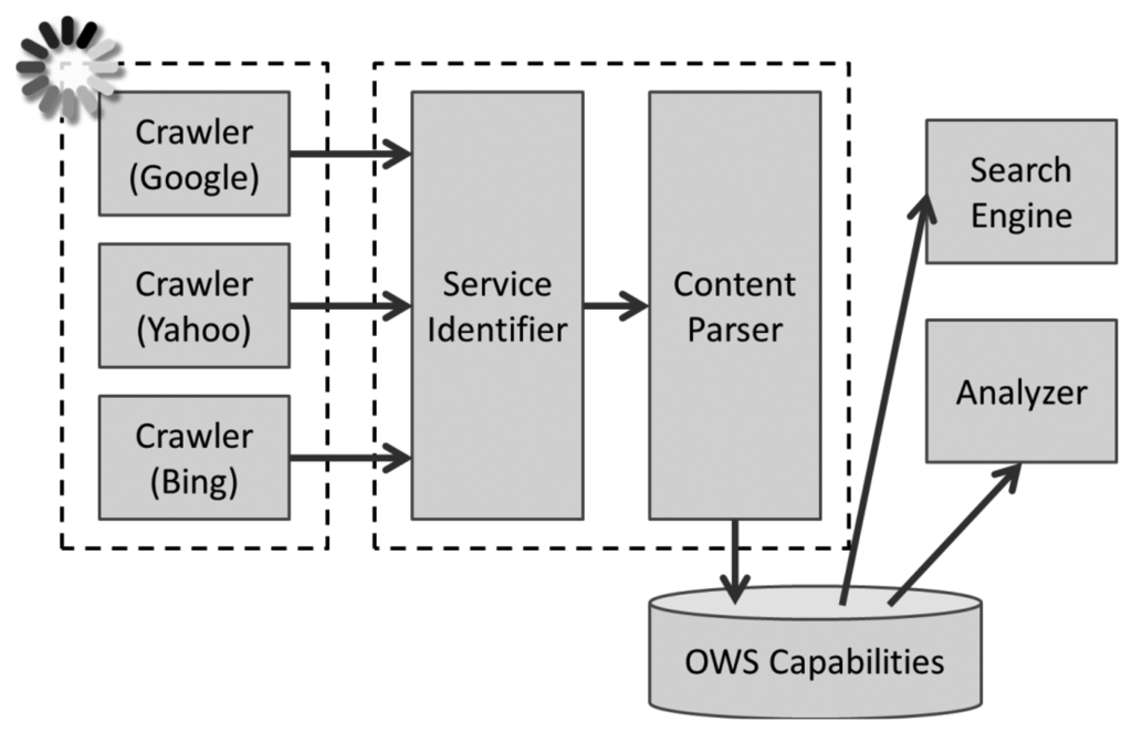 The GeoCENS search engine is also able to discover non-GeoCENS OGC web services (OWS), which are not on the P2P overlay network. The GeoCENS search engine implements crawlers to periodically look for and index online OWS services. Therefore, users can still be able to find these services through the GeoCENS search engine. The architecture of the GeoCENS search engine is shown in Figure 4. Currently, the GeoCENS search engine has discovered 2,884 WMS services, which have 88,281 WMS layers, and 36 SOS services, which have 5,310 SOS observation offerings and 39,368 sensors/procedures. Please note that currently GeoCENS only supports SOS version 1.0. SOS version 2.0 support is a future work item.