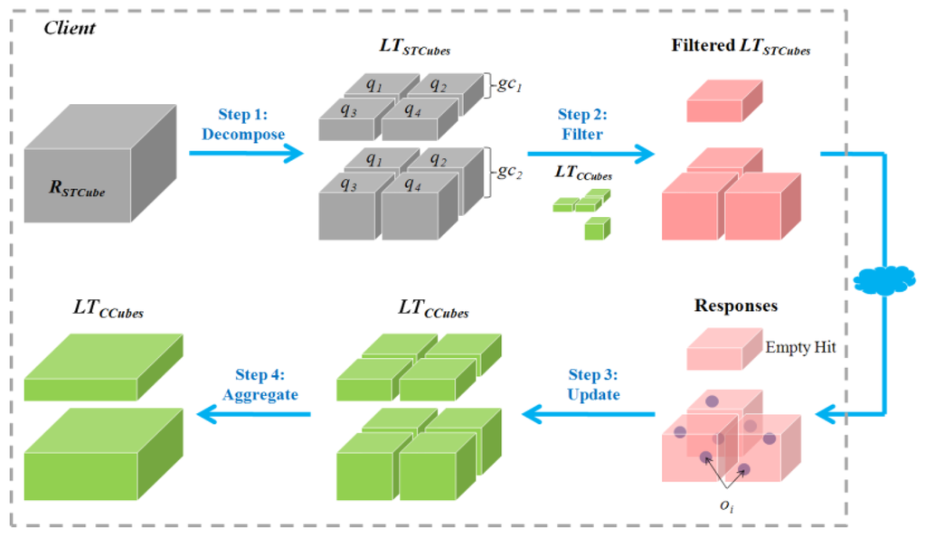 The GeoCENS sensor web browser was developed on top of the open source WorldWind virtual globe system ( http://worldwind.arc.nasa.gov/). To the best of our knowledge, it is the world's first OGC-based sensor web 3D browser. The GeoCENS browser has two unique components/contributions. (1) In order to interoperate with existing sensor web servers, an OGC SWE communication module was developed to communicate with OGC SWE-compatible servers. (2) In order to prevent transferring large volume of sensor data across the network repeatedly, a new spatio-temporal data loading module was developed. This new module was named LOST-Tree [31] and it utilized a client-side cache. LOST-Tree applies predefined hierarchical spatial and temporal frameworks to index requests instead of responses. This allows LOST-Tree to become scalable regarding the number of sensor observations. As shown in Figure 5, LOST-Tree mainly has four steps. First, LOST-Tree decomposes user's spatio-temporal query (RSTCube) into indexed spatio-temporal cubes (LTSTCubes). Then LOST-Tree filters out the spatio-temporal cubes that have been loaded and cached locally (LTCCubes) from the LTSTCubes. As the sensor data in LTCCubes can be loaded from the local cache, the data in the filtered LTSTCubes will be retrieved from the service. After retrieving the data from the services, LOST-Tree updates the LTCCubes and aggregates these loaded spatio-temporal cubes/indices to reduce the memory footprint. A screenshot of the 3D virtual-globe-based sensor web browser is shown in Figure 6a.