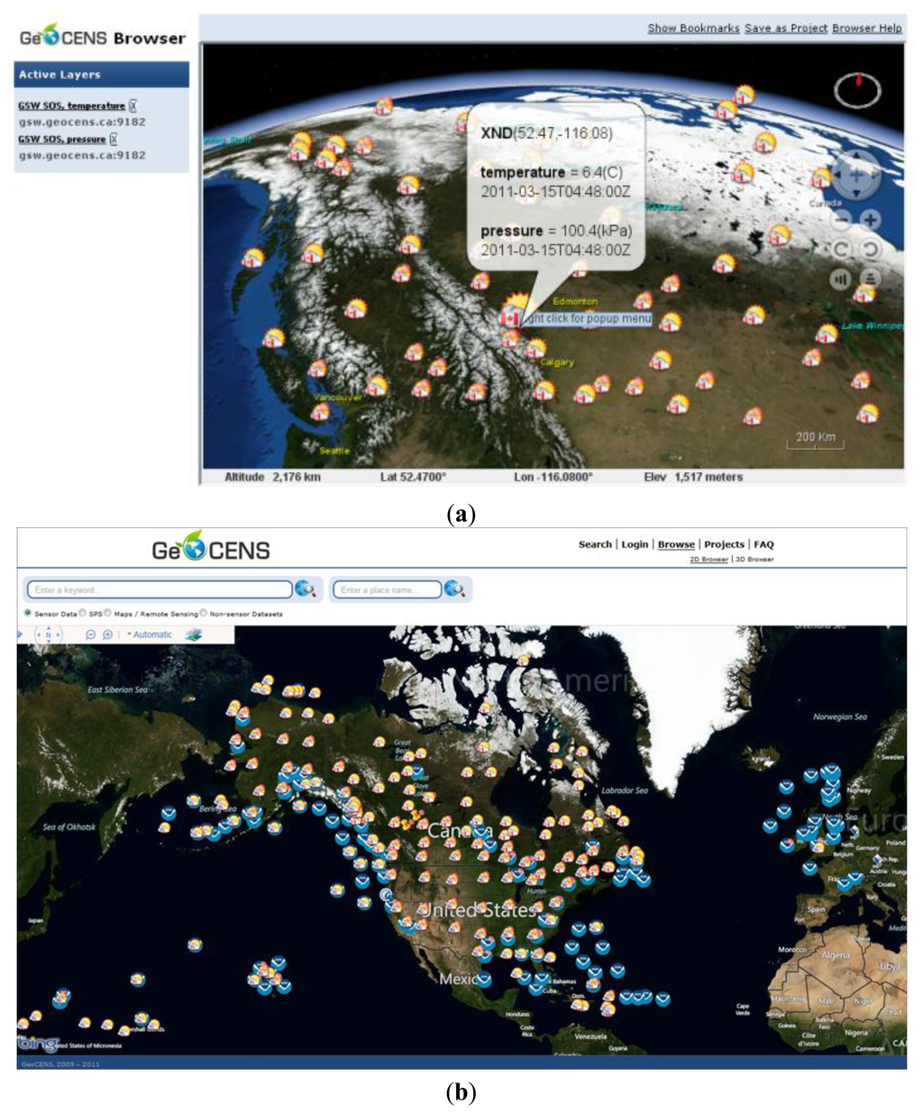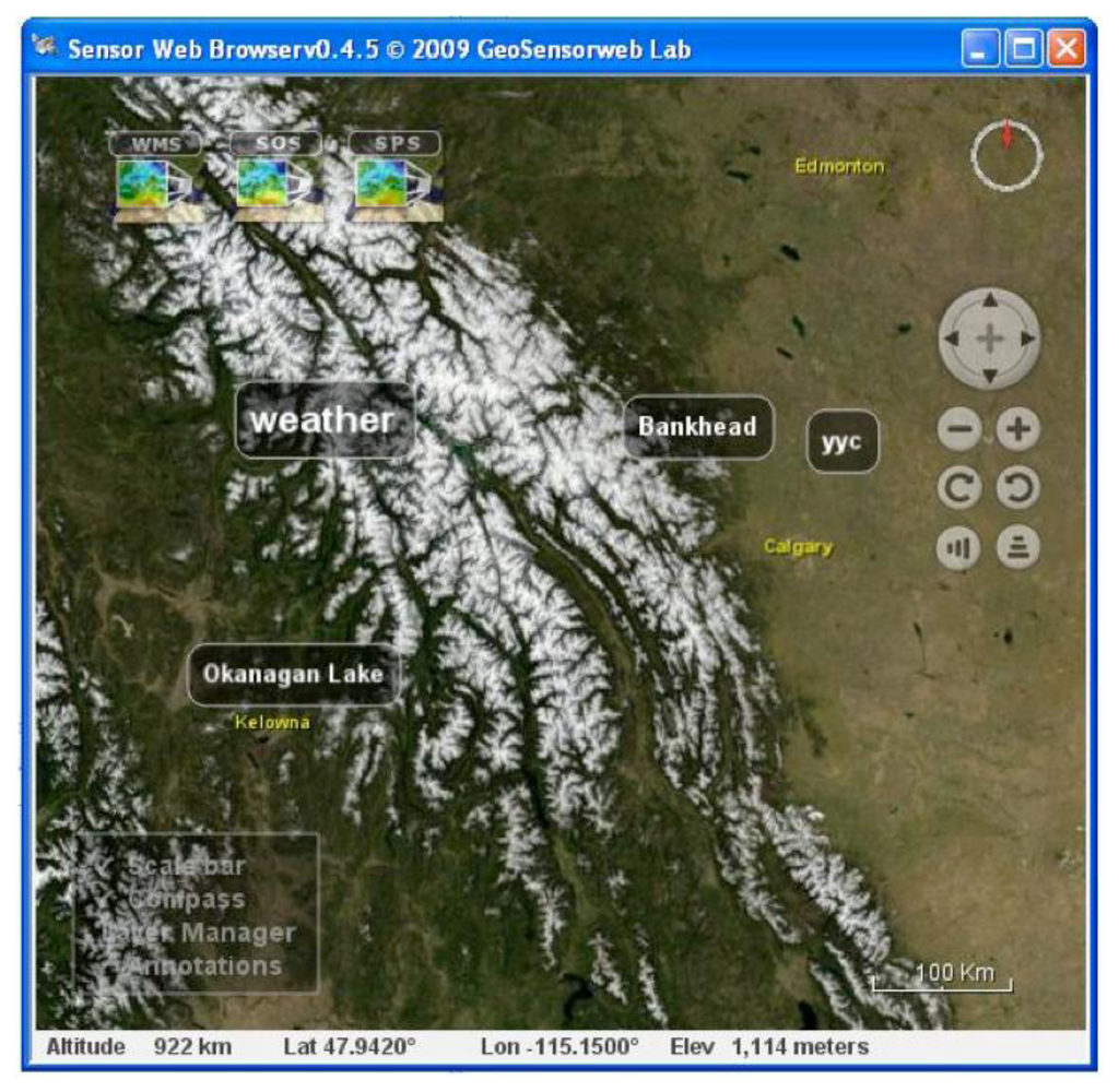 4.3. 3D Virtual-Globe-Based and 2D Map-Based Sensor Web Browsers