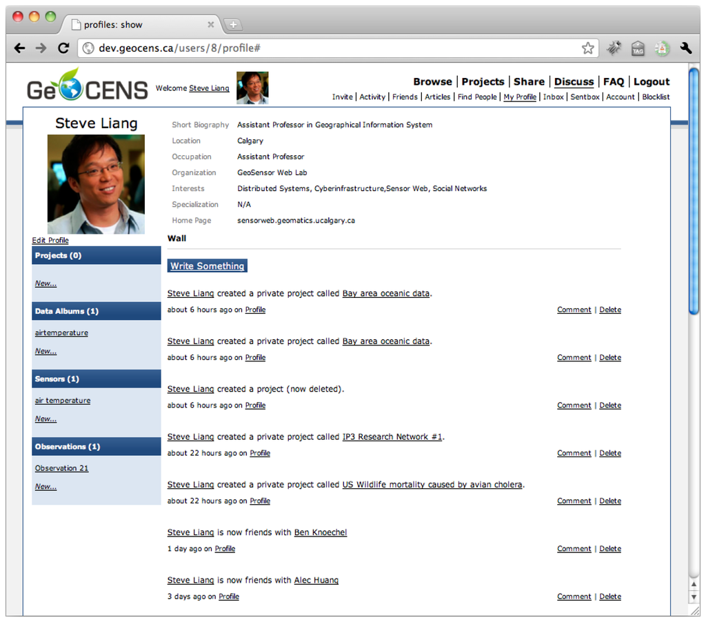 GeoCENS is an OSN-based sensor web platform for researchers. On GeoCENS, researchers can share sensors, scientific datasets, experiences, and activities with their friends (e.g., colleagues from other institutes) and social networks. GeoCENS users can create a profile where they declare their research interests and preferences, and establish friendships with other users. Figure 7 shows an example of the GeoCENS user profile. A “friendship” is formed on GeoCENS when one GeoCENS user sends a friendship invitation to another user. Upon confirmation by the latter, the friendship relationship is formed. Other features include the ability to: upload sensor datasets, join projects/groups with shared area of research interest. GeoCENS users have the ability to adjust different privacy levels, and review/annotate/rate sensors as well as datasets.