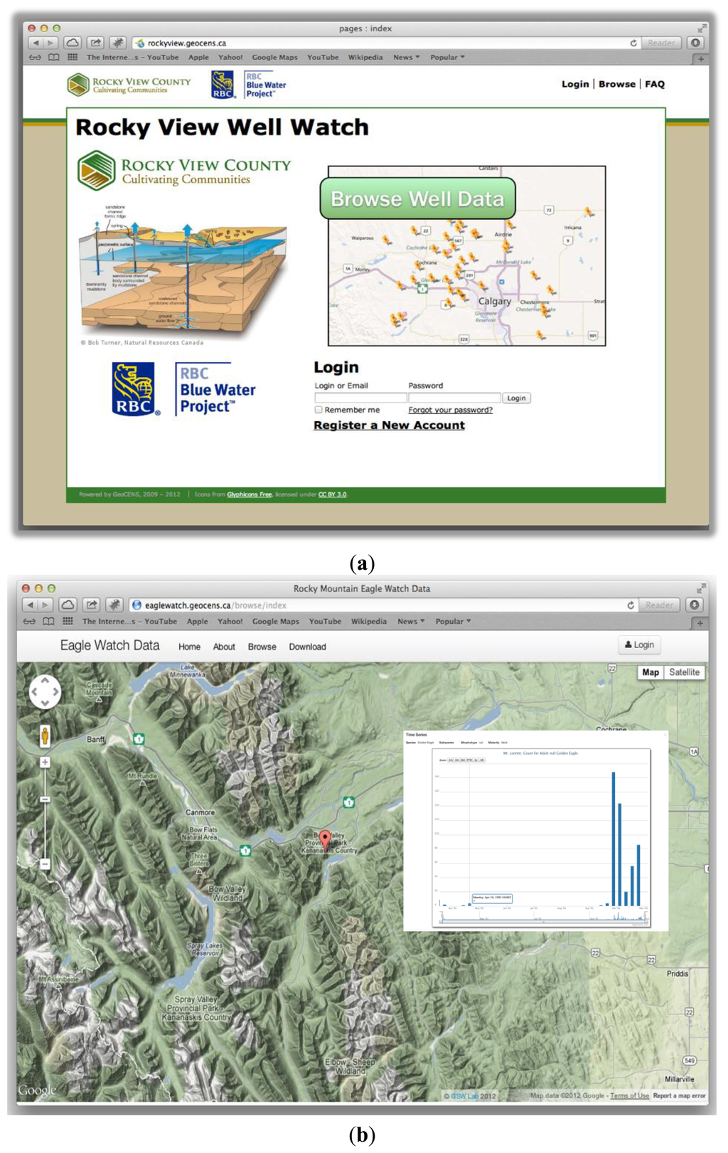 As the GeoCENS project is designed for environmental researchers, we have also demonstrated that the GeoCENS architecture can be applied to many applications. For example, the Rocky View Well Watch project ( http://rockyview.geocens.ca/) is a long-term groundwater monitoring project incorporating the Web 2.0 and VGI concept, where farmers can upload water level data of their water wells. Currently, the Rocky View Well Watch project has more than forty active water well owners, and the earliest data can be traced back to 2008. In addition, when the farmers upload their well readings, some hydrologists at the University of Calgary receive notifications and perform quality control (QC) processes. A screenshot of the Rocky View Well Watch project is shown in Figure 9a. As for the current status of the Rocky View Well Watch project, we are working with different municipalities to expand this well watch platform from a county-wide network to a nation-wide network.