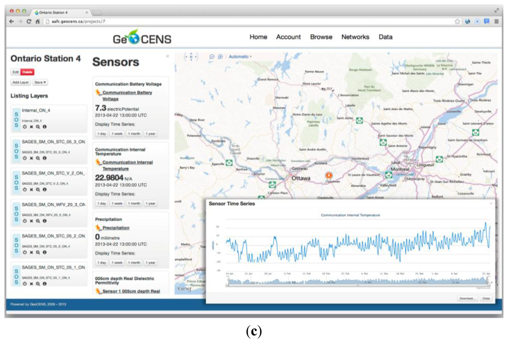 The third powered-by-GeoCENS project is the Agriculture and Agri-Food Canada—Real-Time In-Situ Soil Monitoring for Agriculture (RISMA) ( http://aafc.geocens.ca/). Soil moisture is a critical variable in agriculture environmental monitoring. Soil moisture is a determinant for rates of crop growth and productivity as well as rates of soil biogeochemical processes that impact soil fertility and determines boundary layer conditions that drive meteorological processes. In 2010 and 2011, Agriculture and Agri-Food Canada (AAFC), in collaboration with Environment Canada, established five in-situ monitoring networks. The networks were established near Kenaston (Saskatchewan), Carman (Manitoba), and Casselman (Ontario) as part of the Sustainable Agriculture Environmental Systems (SAGES) project titled Earth Observation Information on Crops and Soils for Agri-Environmental Monitoring in Canada. The near real time in-situ soil moisture/temperature and precipitation data from these five networks are used to calibrate and validate remote sensing and modeled soil moisture products. This project adapts the GeoCENS architecture to provide an interactive map of the network station locations and to view time series graphs of current and past data. Furthermore, users can sign up and log-in to download data series. Figure 9c shows a screenshot of the RISMA project. As for the status of the RISMA project, the number of sensors grows from 283 sensors in Ontario early 2013 to more than 1,408 sensors in three Canadian provinces in August 2013. We expect that this project will host more sensors in the near future and consequently becomes a Canadian monitoring network.