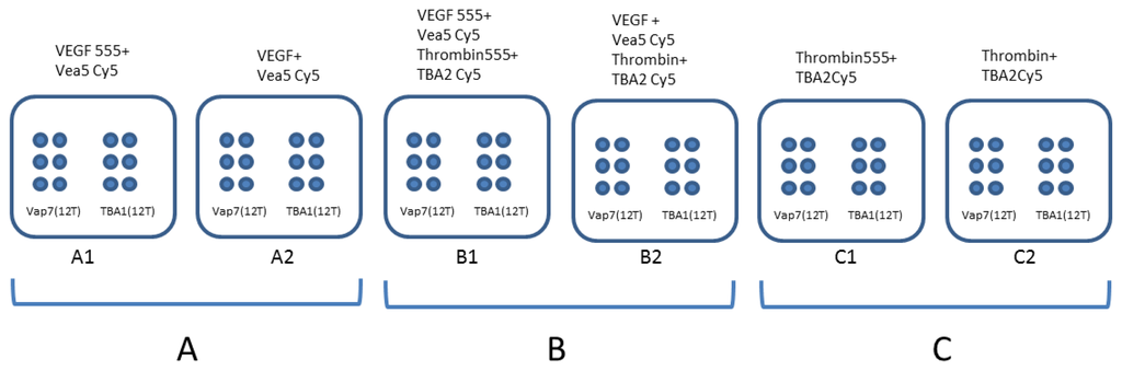 For the experiment also involving thrombin, detection layer, capture layer and fluorescent thrombin were prepared and incubated as previously described [5]. Different proteins amounts were incubated in presence of detection pre-folded aptamers (VEa5-Cy5 and TBA2-Cy5) using the “one-step” procedure. The experiments were conducted using each protein (VEGF165 and thrombin) alone or mixed together, as shown schematically in Figure 1. The binary complexes were analyzed on slides printed with both Vap7(12T)NH2 and TBA1(12T)NH2. The slide contains 6 identical sub-array, each of them with six spots of Vap7(12T)NH2 aptamer and six of TBA1(12T)NH2 aptamer. In Panel A the AlexaFluor® 555 labeled (VEGF555) or unlabeled VEGF165 protein (VEGF) bound to VEa5-Cy5 aptamer was incubated on both sub-arrays. The same experiment was conducted with human thrombin (labeled and unlabeled) on Panel C and in presence of the mixed VEGF and thrombin (labeled and unlabeled) in Panel B.
