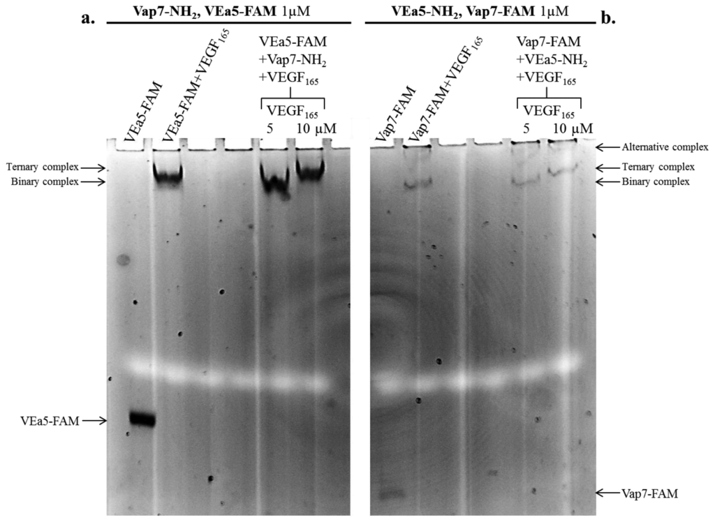 In Figure 2a (Vap7-NH2 and VEa5-FAM) the free fluorescent aptamer is strongly shifted up in the gel in the presence of 5 µM VEGF165 (binary VEa5-FAM-VEGF165 complex). When VEa5-FAM and Vap7-NH2 were incubated simultaneously with 10 µM VEGF165 the fluorescent band is super-shifted, exhibiting a lower electrophoretic mobility than the binary complex, consistent with the formation of the ternary complex. The biochemical analysis indicates however that the ternary complex with VEGF165 is weaker than expected, since it is evident only at the higher concentrations of protein: at 5 µM protein no ternary complex formation is evident in solution, indicating that the aptamer sandwich has lower affinity for VEGF165 at the basic pH conditions employed.
