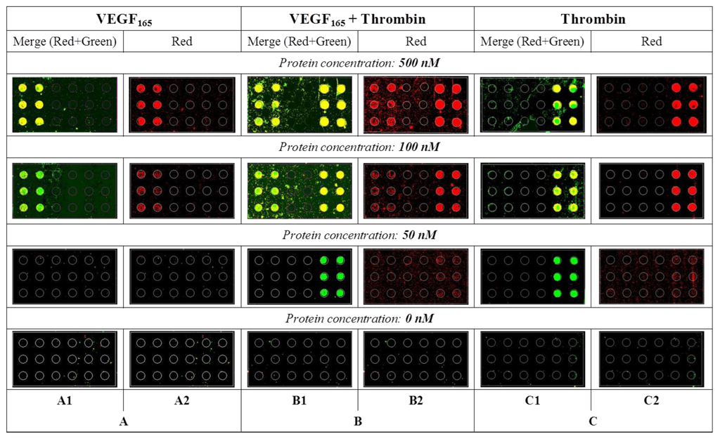 Having established that each protein, is also specifically recognized and fixed on the glass slide in a complex mix by its proper capture aptamer, we proceeded with the development of multiplex SAM for the simultaneous detection of mixed VEGF165 and thrombin. Figure 4 reports the results of these experiments performed at different protein concentrations.
