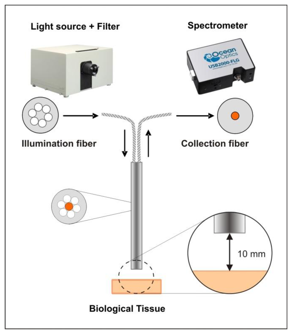 - Palmer, G.M.; Marshek, C.L.; Vrotsos, K.M.; Ramanujam, N. Optimal methods for fluorescence and diffuse reflectance measurements of tissue biopsy samples. Lasers Surg. Med. 2002, 30, 191–200. [Google Scholar]