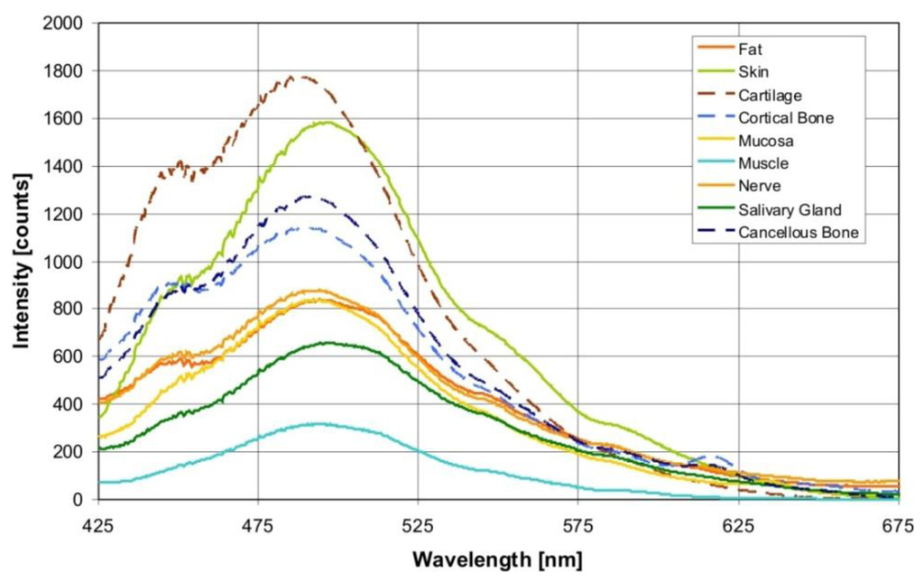 Figure 2 shows the averaged autofluorescence spectra collected from the investigated tissue types (averaged over 900 measurements per tissue type). The measured autofluorescence spectra showed a superposition of broad emission peaks in the visible wavelength range with a maximum at 440–450 nm, and at 490 nm.