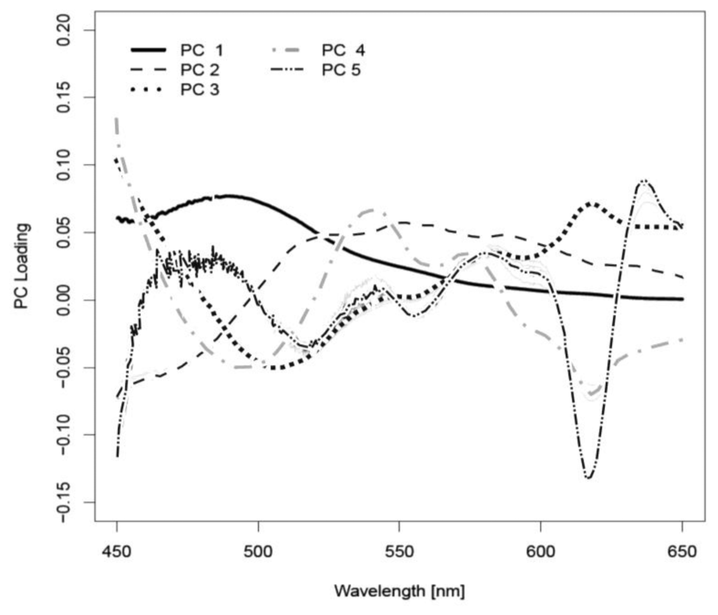 One major optical absorber of biological tissue in the relevant visible wavelength range is oxy- (HbO2) and deoxyhemoglobin (Hb). Hemoglobin exhibits a typical band structure (Soret band), which shows an oxyhemoglobin absorption maxima at 414 nm, 540 and 578 nm []. The influence of hemoglobin on the measured autofluorescence spectra is observable in the form of shallow dips at 540 and 580 nm (Figure 2). It was also detectable in the loading curve of PC4. However, PC4 was only responsible for 0.1% of the variance between the autofluorescence spectra of different tissue types. Hence, we suppose that for tissue differentiation, the tissue structure components play a greater role and the blood circulation plays a lesser role. However, under in vivo conditions, it can be possible to observe a major impact by the blood circulation. Concerning this assumption, further investigations are necessary.