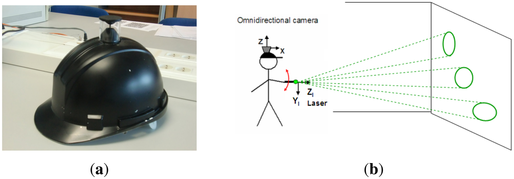 Figure 1. Flexible structured light system. (a) Wearable omnidirectional camera; (b) Configuration of the system.