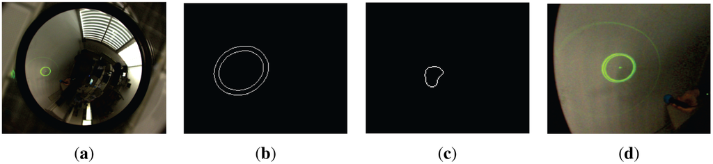 Figure 11. (a) Original image; (b) Pattern light extracted; (c) Laser endpoint extracted; (d) Light pattern detection.