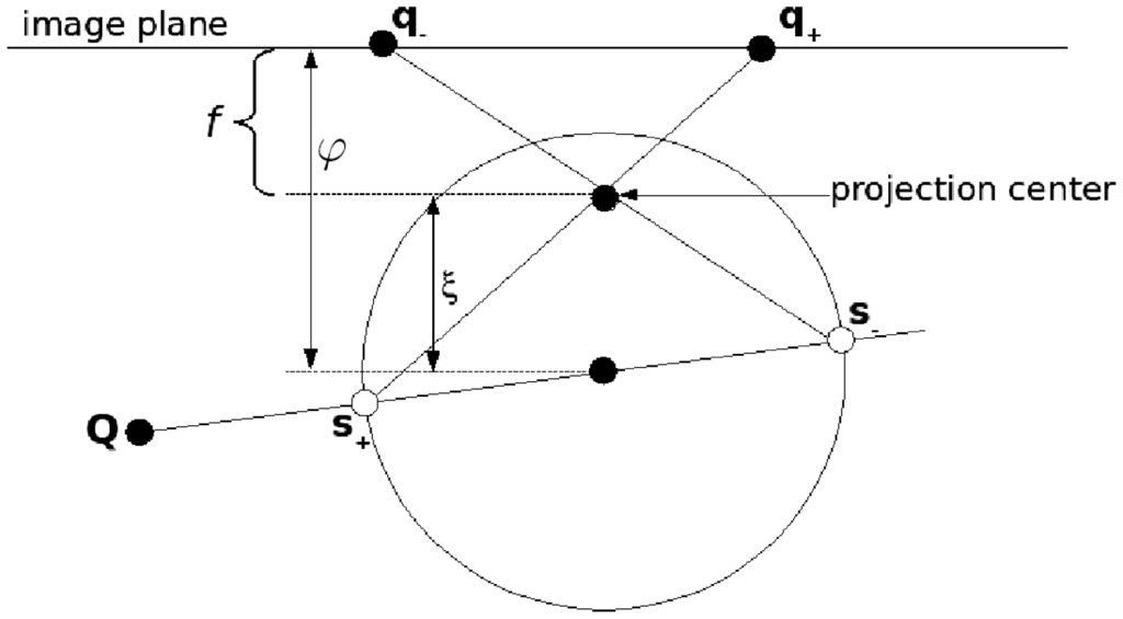 We use the sphere model for catadioptric projection introduced by Geyer and Daniilidis in [25]. This model covers all central catadioptric cameras, encoded by ξ, which is the distance between the perspective camera and the center of the sphere, and ψ, which is the distance between the center of the sphere and the image plane. According to the model, the projection of 3D points Q can be performed in two steps (Figure 2). First, one projects the point onto the unit sphere, obtaining the intersection of the sphere and the line joining its center and the 3D point. There are two intersection points which are represented by s±. Second, these points are projected using a perspective projection P resulting in two image points, q±. Only one of these points is physically true. These steps are encoded in the non-linear function ħ: