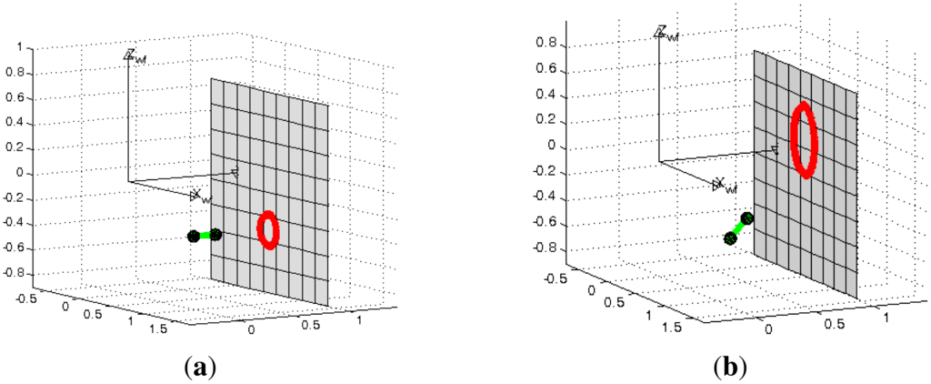 • Two-endpoints: This method detects the whole body of the laser on the omnidirectional image and the sphere attached to it, from which we compute the corresponding 3D rays using Equation (2). With this information and the laser length there are only two possible solutions for the 3D orientation. This situation can be observed in Figure 5b. This ambiguity is solved as follows. For each solution we compute the corresponding projection cone and construct its pencil of quadric surfaces, from which we calculate the corresponding determinants. By evaluating (8) in the two solution we observe that only one satisfies the correspondence condition, being the correct orientation we are looking for. With the two endpoints correctly detected the computation of the 3D orientation is straightforward.
