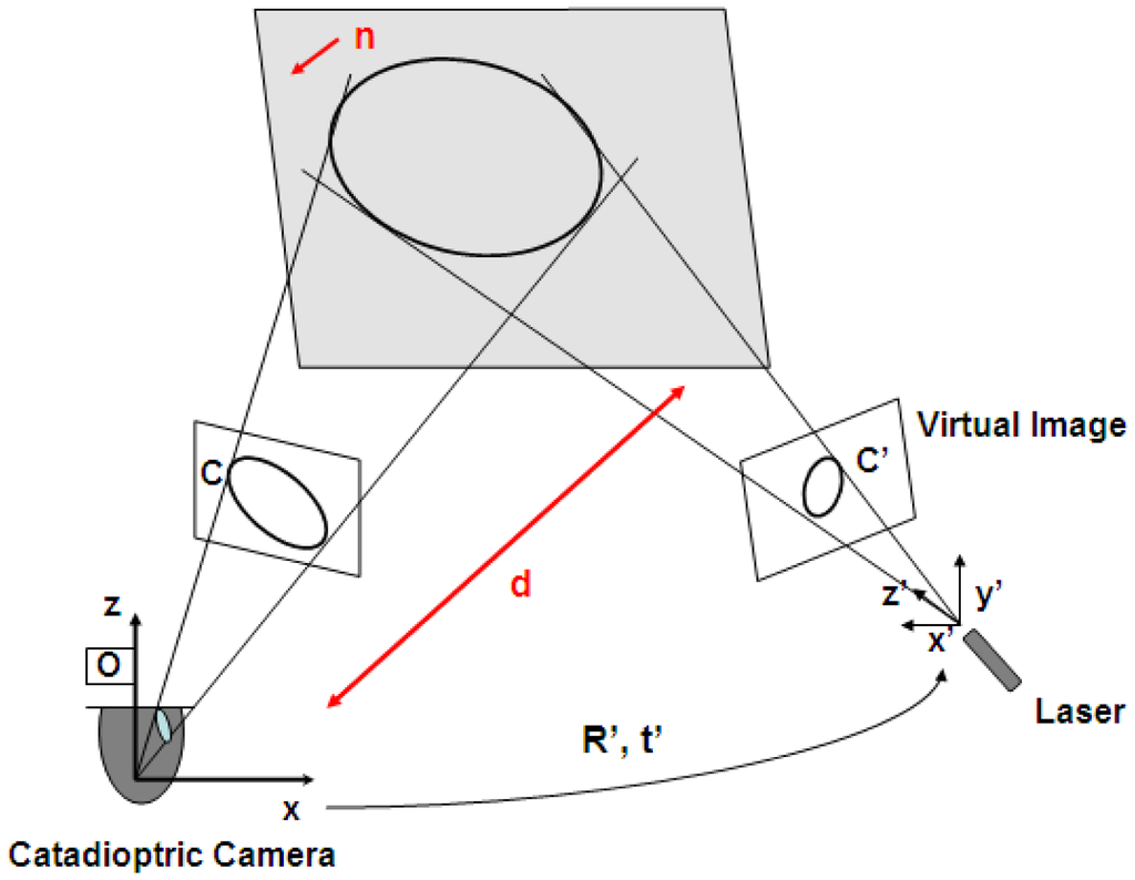 The recovery of 3D information from conic correspondences has been studied in [24,26]. In [26] Conomis proposes the use of homographies, but this approach requires at least two conics to be observed and matched in at least two images. On the other hand, Quan [24] presents a stereo configuration in which only one conic has to be observed in at least two images to compute the location of the projection plane in the scene. Our approach is based on the algorithm proposed by Quan where one image is given by the omnidirectional camera and the second is a virtual perspective image generated from the calibrated light emitter (see Figure 4).