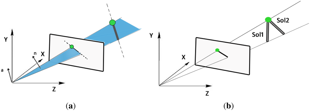 Figure 5. Methods to compute the orientation of the light emitter. (a) Method based on the plane defined by the laser and one endpoint; (b) Method based on the extraction of the laser endpoint and known length.
