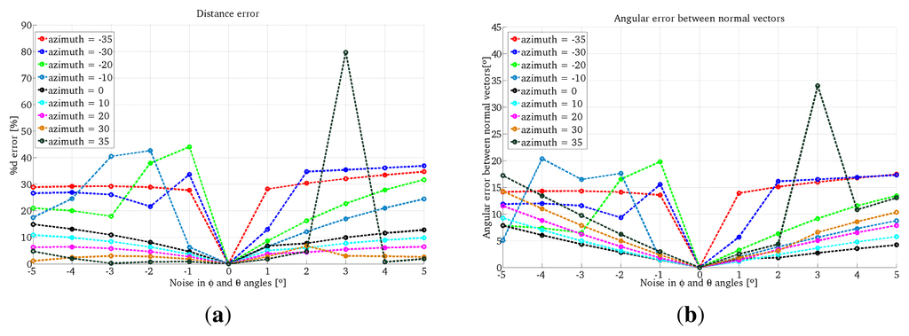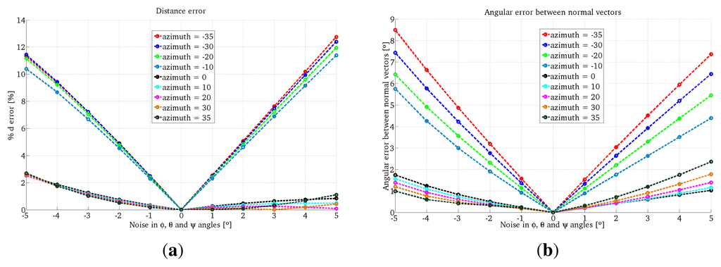 Figure 8. Simulation results using Two-endpoint method with one conic projection. (a) Error in depth; (b) Error in the surface orientation.