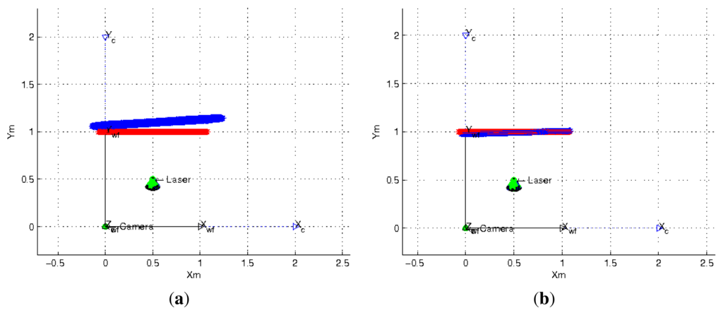Figure 9. Estimation of a plane located 1m from the camera. Real plane in red and estimated plane in blue. (a) Plane computed using One-endpoint method; (b) Plane computed using Two-endpoint method.