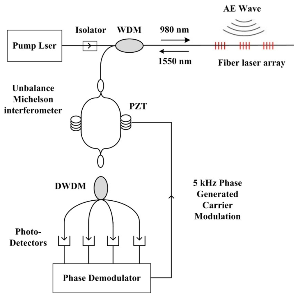 The acoustic emission experiment is carried out in a large marble stone. The DFB fiber laser is glued to the marble plate and operate at different center wavelengths with 300 GHz (2.4 nm) spacing from 1,529 nm to 1,546 nm, and pumped through a single fiber by a 980 nm pump laser. The center wavelength of fiber laser will be modulated by acoustic waves produced by an acoustic emission source and was demodulated by the demodulation system. Generally, a PZT sensor is also glued to the marble plate close to the fiber laser as a reference.