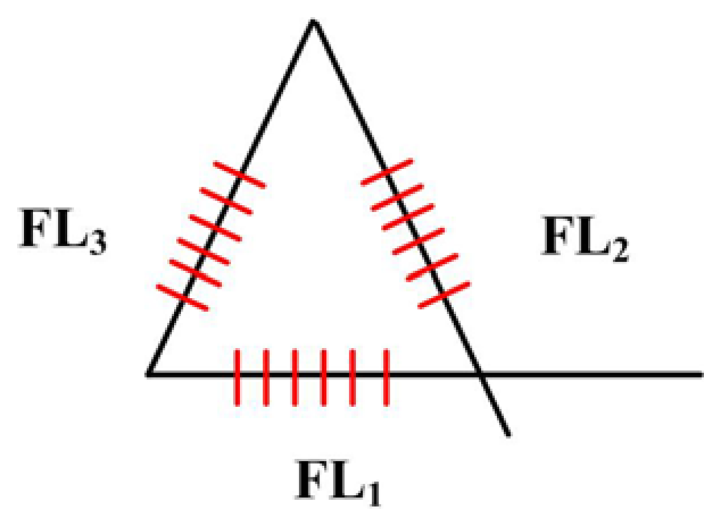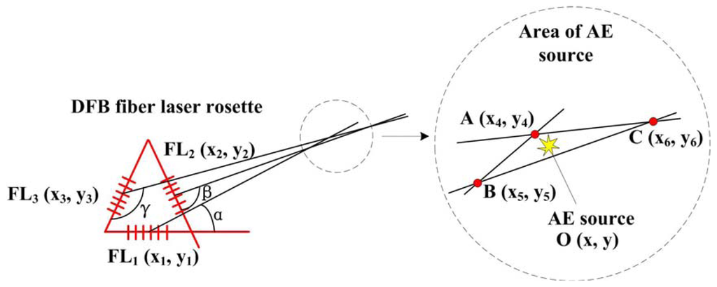 The principle diagram of triangulation approach for AE source location based on DFB fiber laser rosette is shown in Figure 10. Firstly, we can get the direction of the AE source through each fiber laser according to the directivity of DFB fiber laser which is proved in the above experiments. Then three fiber lasers with different angle are used to get the location of the AE source. As shown in Figure 10, we can get three lines which intersect at A (x4, y4), B (x5, y5) and C (x6, y6). These points form a triangle ABC whose center of gravity is the location of AE source. The coordinate of the center of gravity, which is replaced by O (x, y), can be calculated by a simple triangle principle.