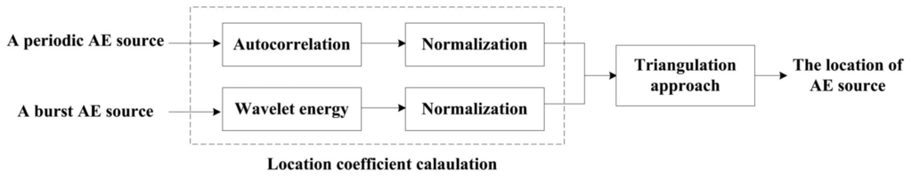 We can thus determine the location of the AE source as we know the coordinates of O (x, y). Then a specific location algorithm based on the directional sensitivity of DFB fiber laser and the triangulation approach is shown in Figure 11. The advantage of the proposed algorithm over the traditional methods based on fiber Bragg Grating (FBG) include the capability of: having higher strain resolution for AE detection and taking into account two different types of AE source. The location calculate algorithm for two different types of AE source consists of three steps: (1) judge the type of the AE source; (2) calculate the location coefficient for AE source location and (3) use the triangulation approach to determine the location of AE source. Here, normalization is processed to eliminate the influence of distance and intensity of AE source.