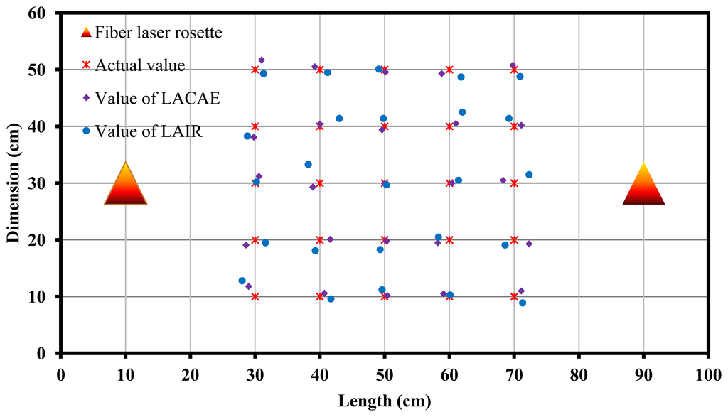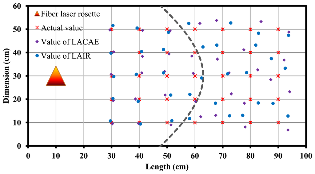 The AE source location test based on one DFB fiber laser rosette (Figure 13) and two rosettes (Figures 14 and 15) were performed. From the test result, we can see that the location error is less than 2 cm within the circumference of 50 cm where the fiber laser rosette is the center circle. And the location accuracy and distance is limited by the distance because of the attenuation and interference of AE signals when the acoustic waves spread in the marble plate. The location algorithm of a continuous AE source (LACAE) is based on the relationship between wavelength drift and the angle of a continuous AE source. The location algorithm of an impact response (LAIR) is based on the relationship between percentage of wavelet packet energy and the angle of an impact response.