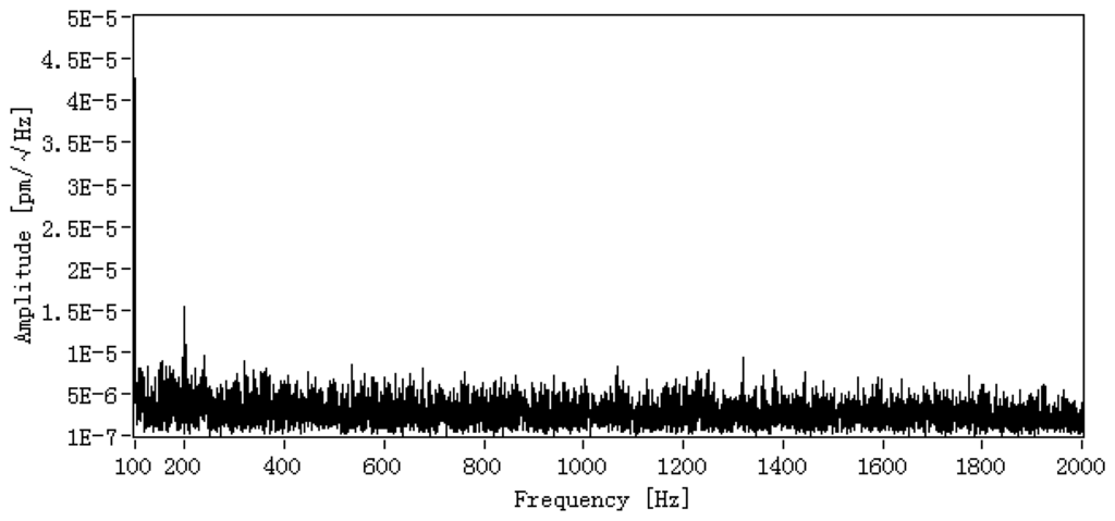 The strain resolution of DFB fiber laser acoustic sensor is limited by system noise level, which is determined by frequency noise and relative intensity noise (RIN) of DFB fiber laser, electrical circuit noise, and environmental noise on the interferometer. The noise level is measured in a quiet laboratory with the isolation of vibrations and acoustic noise. Figure 2 shows the noise level in the frequency range from 20 Hz to 2 kHz and it can be observed that the noise level is below 1 × 10−6 pm/√Hz@1 kHz, which will result in a strain resolution of about 10−12.