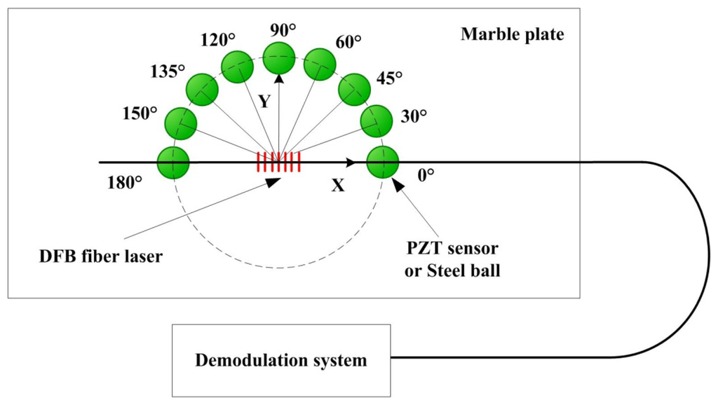 As we know, FBGs exhibit the directional responses and can be used to get the direction of the AE source [19]. In our research, DFB fiber lasers have shown a similar trend. The directional sensitivity of DFB fiber laser is investigated by calculating location coefficient using a method of digital signal analysis. A PZT sensor or steel ball is used as an exciting source respectively, which is shown in Figure 3.