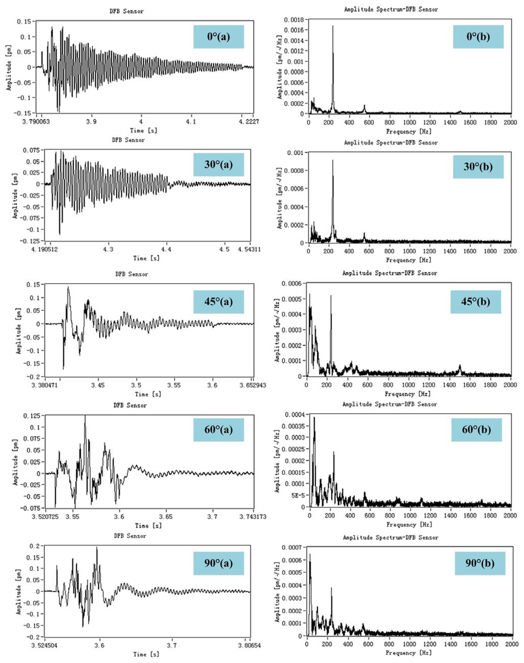 We can see from the frequency-domain response of DFB fiber laser that the energy of dominant frequency around 200 Hz decrease and low-frequency component increase, which imply that we can get the direction of a burst AE source according to the size of the dominant-frequency component.