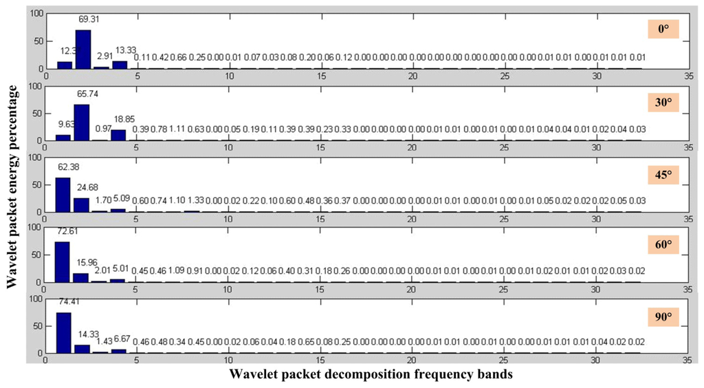 According to impact response we have got, we can calculate the wavelet packet energy percentage when the ball impact at different angle, which is shown in Figure 7. This method can also eliminate the influence of distance and intensity of AE source.
