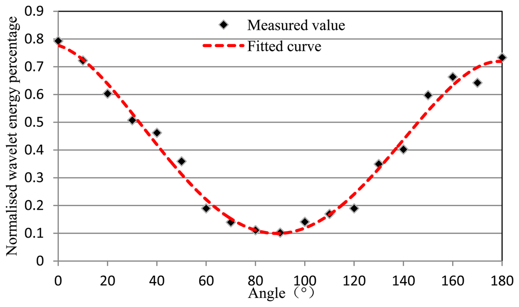 The relationship between percentage of wavelet packet energy and the angle of a burst AE source is shown in Figure 8. And it can be seen from the test results that the curve fitting is tub shape. According to the directional sensitivity of DFB fiber laser, we can use three DFB fiber lasers as a rosette which can determine the source location of an acoustic wave. Here, we can get the location coefficient of a periodic AE source from Figure 5 and get the location coefficient of a burst AE source from Figure 8. Then we can calculate the information for AE source location using an appropriate algorithm based on the location coefficient. This process is directly analogous to the use of ESG or FBG rosettes to determine principal strain magnitudes and directions.