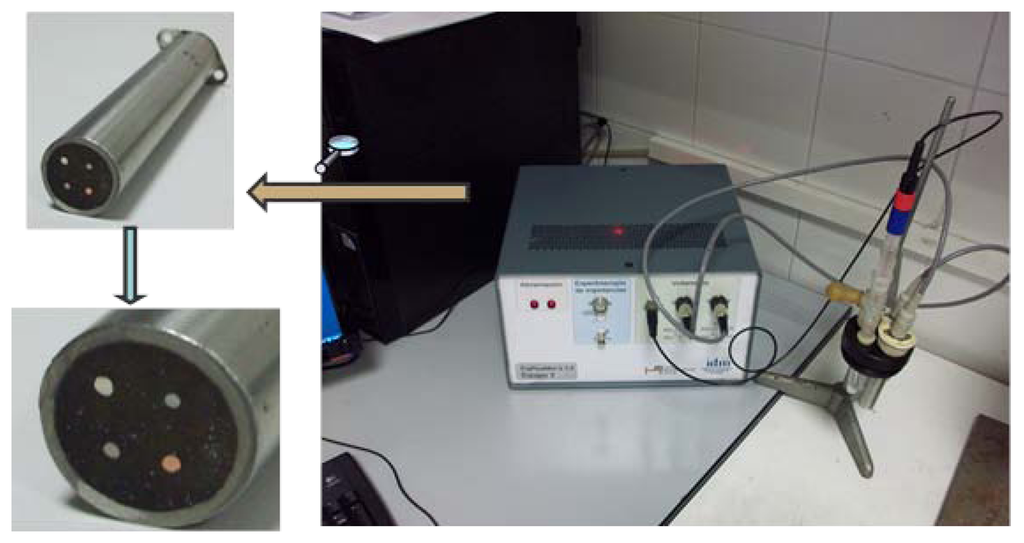 The electrochemical characterization of NH4NO3 solutions were performed using an Autolab PGSTAT100 instrument (Eco Chemie, Utrecht, The Netherlands). The electrochemical characterization was carried out using aqueous solution 0.01 mol·L−1 of ammonium nitrate at pH 7 buffered with phosphate at a concentration of 0.01 mol·L−1. All measurements were performed at room temperature (20 ± 2 °C). The electrochemical experiments were carried out using the electronic tongue (containing a set of electrodes housed into a homemade stainless steel cylinder). A SCE was used as reference electrode. The cyclic voltammetry experiments were carried out at a scan rate of 100 mV·s−1.