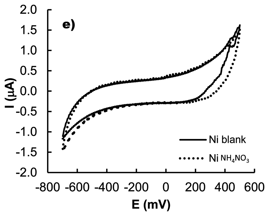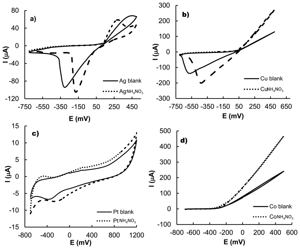 In order to explore more in detail the response of the metallic electrodes in the presence of NH4NO3, the electrochemical behaviour of this salt was studied in water by cyclic voltammetry (10−2 mol·L−1 phosphate buffer at pH 7) using Au, Pt, Rh, Ir, Cu, Co, Ag and Ni as working electrodes. As it is well-known, the voltammetric response of a certain compound depends on the intrinsic chemical nature of the both the electrode and the electrochemical characteristics of the redox-active species. The electronic tongue device relies in the concept that subtle differences between relatively similar compounds might be reflected in the specific differential voltammetric response of the electrode ensemble.