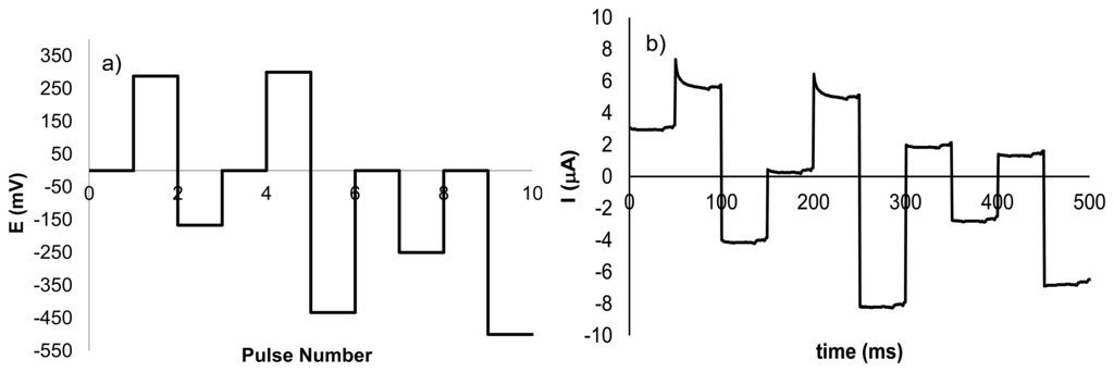In previous works, we have demonstrated the importance of applying a suitable set of pulses in the electronic tongue in order to be able to detect certain compound in solution [16]. With this concept in mind, the waveform used in the discrimination of NH4NO3 was designed using the electrochemical response found for NH4NO3 in the voltammetric studies described above. Figure 3a shows the sequence of pulses used in the electrochemical tongue. Pulses 2 and 3, with values of 288 and −167 mV, respectively, were selected bearing in mind the corresponding oxidation and reduction peaks when a silver electrode was used. Pulses 5 and 6, having a potential of 300 and −433 mV were related with the redox processes observed for NH4NO3 with the copper electrode. Ammonium nitrate provided a small peak at −250 mV (pulse 8) when platinum electrode was used. The pulse of −500 mV was introduced due to the presence of a small increment in current in the presence of NH4NO3 observed for the Pt electrode. Finally, pulses with potential of 0 mV were added in other to obtain information about non-faradic processes. Figure 3b shows the current intensity when the waveform is applied to a sample with concentration 1 × 10−2 mol·L−1 using as working electrode a Ni electrode.