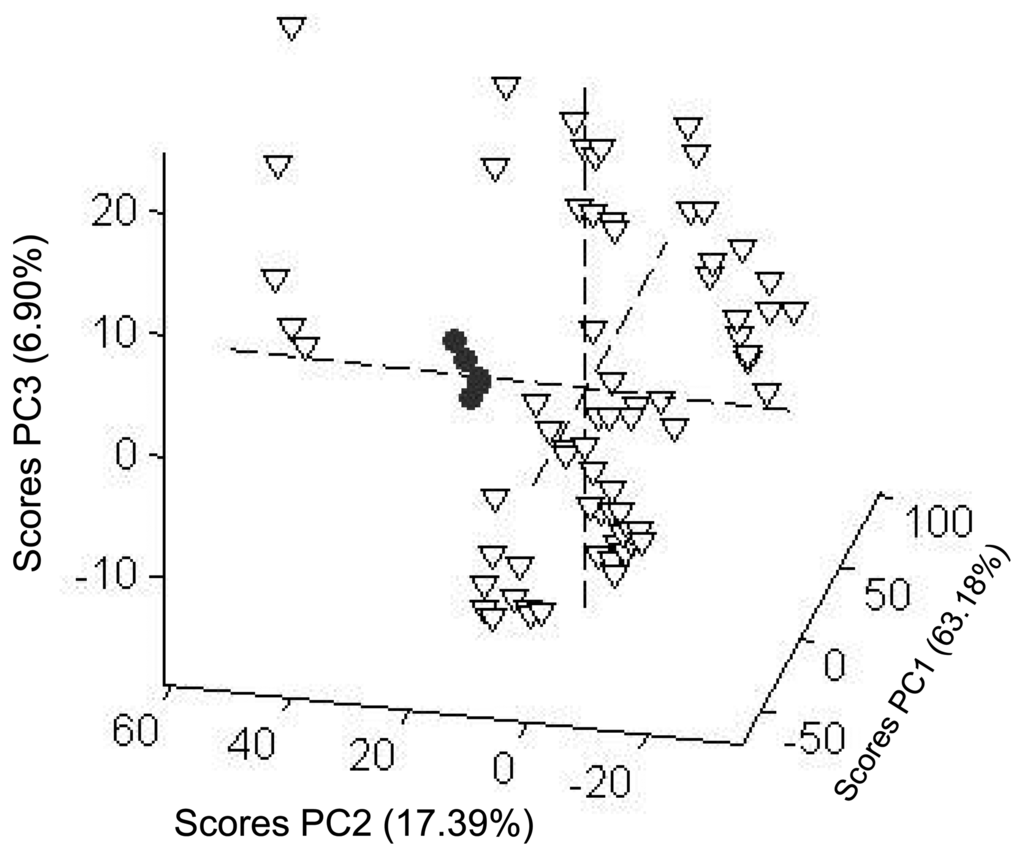 The PCA score plot of the results obtained from the voltammetric tongue in the presence of the selected salts (vide ante) is shown in Figure 4 for five different trials. The first principal component contained only 63.18% of the variance and the first three components represented 87.47% of total variance of the data. The three dimensions PC1, PC2 and PC3 in PCA plot were enough to differentiate the NH4NO3 samples. From Figure 4 it can be observed that the samples corresponding to the ammonium nitrate salt (represented by dots) appeared well separated, whereas the remaining salts (triangles) are distributed in different sites in the PCA plot. This is a promising result that suggests that the differential response in the voltammetric technique, using a set of electrodes, might be a suitable method for the detection of NH4NO3 in aqueous samples.