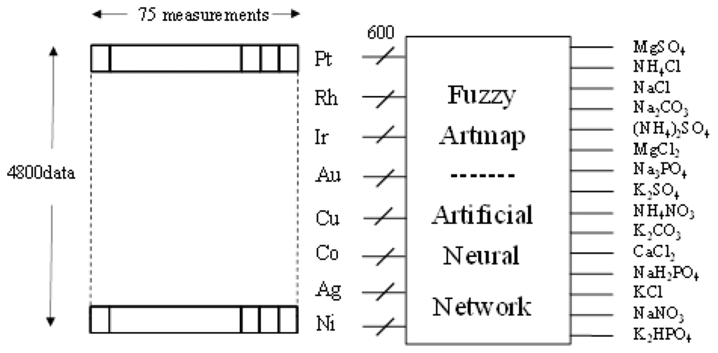 In addition to PCA, a quantitative analysis of the electronic tongue discriminatory power was carried out by means of artificial neural networks. For this purpose a neural network was developed to analyze the data obtained from the electronic tongue to determine which type of salt corresponds of the fifteen samples of the different salts analyzed. The neuronal network type used was Fuzzy-Artmap. The network uses a training step with a set of measurements and a further step for validation. For each measurement, a vector of 4,800 data points enters the network and it tries to determine to which type of solution corresponds through 15 digital outputs. This process is repeated with the rest of the measurements, so that the activated output will have the value of “one” and the not activated outputs will have “zero” value (See Figure 5).