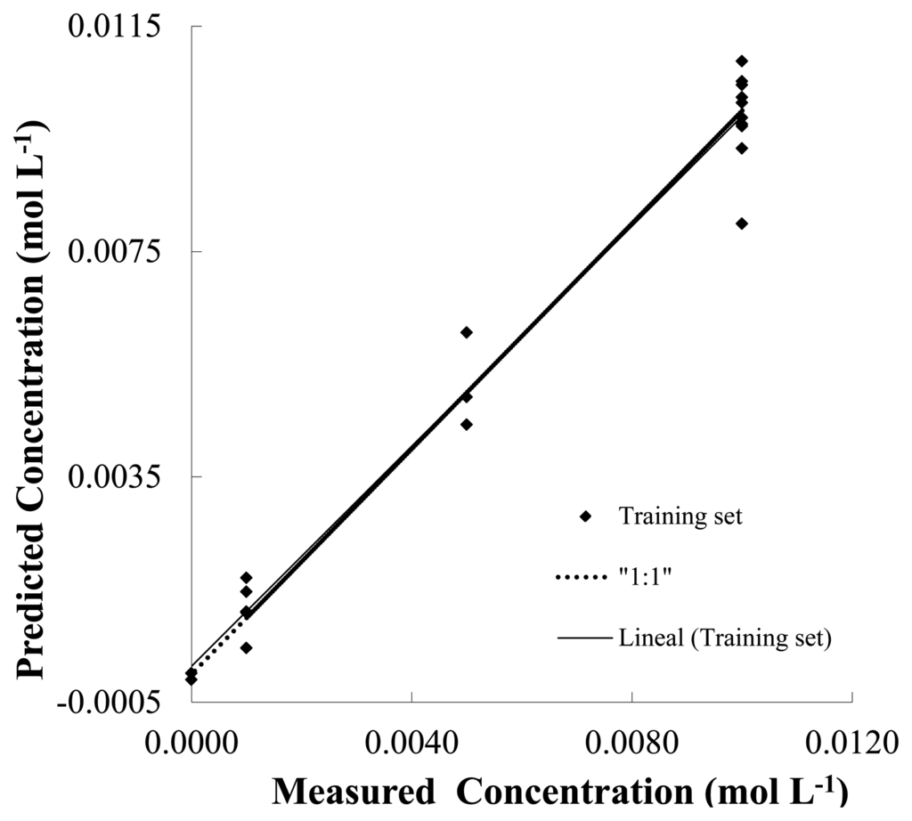 For quantitative analysis studies PLS techniques were applied. The main objective of PLS regression is to predict Y from X, by simultaneous decomposition of those matrixes or vectors in a group of components (latent variables) which explain as much as possible the covariance of X and Y [25]. Prediction models are created by using the calibration set (standards) and the collected data. Prior to build the model, “leave-one-out” cross validation technique was used to evaluate the adequacy of the experimental data, and to select the quantity of latent variable, indicating that 7 latent variables explain the 89% of the accumulated variance. All statistical analysis was performed with the software Solo (version 6.5, Eigenvector Research, Inc., Wenatchee, WA, USA).