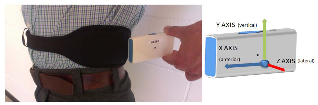 The IMU presented contains a triaxial accelerometer, gyroscope, and magnetometer. It also includes a temperature sensor. The 9 × 2 has a power management module which contains a battery charger and a battery monitor that provides information of the battery status to the user. The sensor is totally wearable being smaller than a mobile phone and suitable to be worn on the body with, for instance, the specifically developed neoprene belt shown in Figure 1.