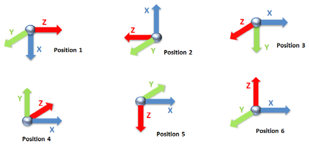 The calibration of the accelerometer is based on using six positions for which the actual value is known, according to Figure 3. These positions correspond to the alignment of the three accelerometer axis with the gravity. During the alignments, 6 seconds of inertial data are recorded and filtered with a 2nd order Butterworth filter at 5 Hz.