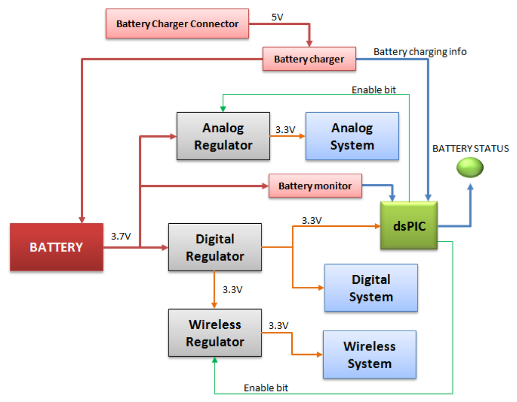 In order to reduce consumption, the firmware can enable and disable the Analog and Wireless Regulator when necessary. The system remains in operating mode only when data need to be captured, data are needed to be sent or when an algorithm is being executed.
