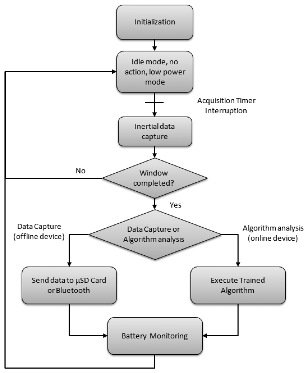 Figure 5 presents a diagram that describes how these independent processes interact with the main process and their relation with the interruptions. The main process initializes the other five processes. Some processes are only executed after an interrupt request. For instance, the process of capturing inertial data is executed immediately after an interrupt request of the data acquisition timer. Bluetooth and μSD Card processes are also executed only when an interrupt request is produced. In the case of μSD Card, when the acquisition buffer is full, a DMA interrupt is launched which starts the data storage. In the Bluetooth case, bluetooth reception interrupts launch the corresponding process when an external command is received. Moreover, timer interrupts also launch the Bluetooth process in order to send data, such as algorithm's output or raw data. Battery management and online classifiers are executed within the main process both after data are captured and before the MCU enters Idle mode.